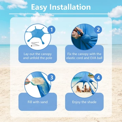 - Easy Assembly & Includes a Sand Shovel: The beach sun shelter is easy to set up, and all you need to do is lay out the canopy and unfold the pole, fix the canopy with the elastic cord and EVA ball, and then fill it with sand. And it comes with a sand shovel for quickly holding a large amount of sand.