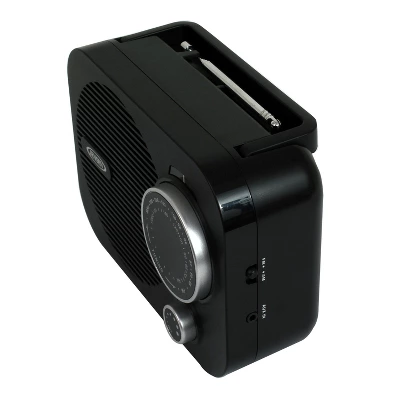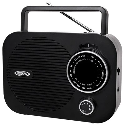 This JENSEN MR-550 is an attractively styled and portable AM/FM radio. The large analog tuning knob simplifies adjusting to your favorite station, and the speaker delivers excellent sound with clear and static-free audio. Play music from other devices like your tablet, iPod, MP3 player, or other digital audio players using the built-in auxiliary input jack. The compact, durable design features a carrying handle and telescopic antenna. The MR-550 operates on 120V AC or on four (4) x “C” batteries (not included) and makes the radio suitable for taking it with you anywhere you go.