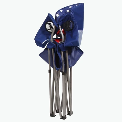 Sit comfortably wherever you are. Strong, comfortable and convenient, the Kamp-Rite Folding Quad Lawn Chair is great for porches, boats, campsites, tailgating, and more. This traditional quad style chair features the Stars and Stripes to add a patriotic touch to any event. You can take this camping chair anywhere thanks to its strong-yet-lightweight, powder-coated steel frame that sets up quickly and easily. Dual mesh cup holders keep beverages and personal items within easy reach. This lightweight chair folds compactly and stores in a sling-strapped carry bag for easy transport. This outdoor folding chair measures 24 inches long, 36 inches wide, and 42 inches tall when set up. The camping chair holds up to 300 pounds, making it a great piece of camp furniture for anyone.Sit back, relax, and enjoy your time in the backyard, on the patio, at your campsite, or tailgating on the the Kamp-Rite Folding Quad Lawn Chair.