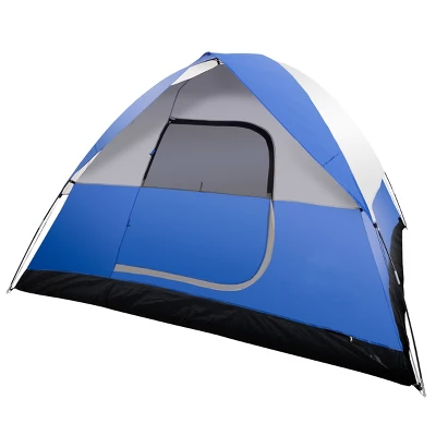 - PRODUCT DETAILS – Materials: 190T Polyester with PU Coating, 110g/M2 PE, Fiberglass, and Mesh. Dimensions: (L) 10″ x (W) 10″ x (H) 6″. Poles: 9.5mm diameter. Capacity: 6 People. Includes: Portable storage bag and tent stakes. Color: Blue.