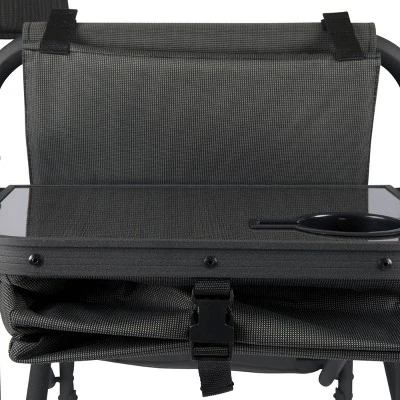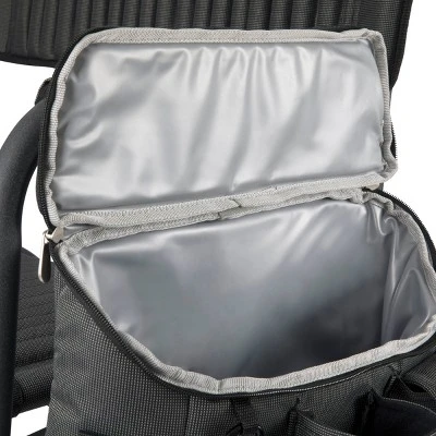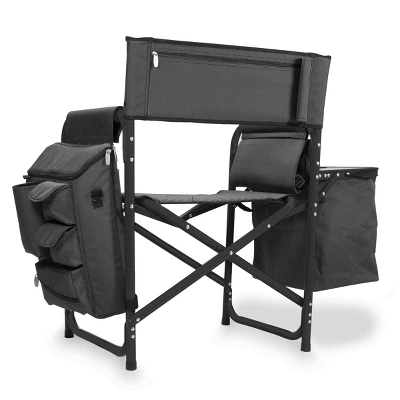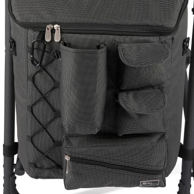 Picnic Time is proud to introduce the Fusion Chair, a portable outdoor backpack chair with so many features, you might make it your new office! A durable, powder-coated aluminum frame and ribbed padding in the seat and back rests is only the beginning – this folding chair keeps unfolding with a tray table on the right side with two-tiered, accordion-style shelves hanging below, a side-mounted, fully-detachable 24+1-can-capacity cooler with its own backpack straps, a cell-phone-specific pocket, specialized fabric loops for an umbrella or sports banner, and numerous pockets. The Fusion is more than a camping chair, it’s a camping throne!
