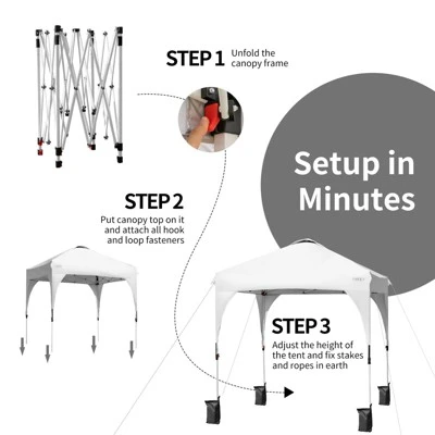 Create large shade outside and enjoy your outdoor activities without annoying sunshine and rain! Our commercial canopy tent offers you up to 6.6’x6.6′ shade, which is big enough to cover one table and several chairs. It also provides 3-level height adjustment to satisfy various requirements. The canopy top is wear-resistant and rainproof to support long time outdoor use. With the heavy-duty steel frame, the sun shelter is stable to stand in wind or rain. Use extra ground stakes, tie-down ropes and weight bags to further enhance its stability. All canopy parts are collapsible or detachable to be organized in the roller bag. This portable bag is not only for easy carrying, but also for convenient storage. If you need a canopy, do not hesitate and get this one home!