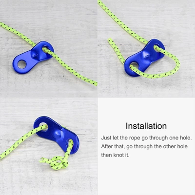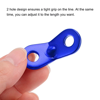 What is this?The aluminum rope tensioner mainly functioning on secure ropes from slipping. Widely used in various places, such as beach, sand, lawn, soil, and so on to fix your camping tent, canopy, picnic mat, rain tarps, fabric net.What will I get?Color: BlueMaterial: Aluminum AlloyHole Diameter: 7mm/0.28″Overall Size: 39mmx16mmx2.4mm / 1.54″x0.63″x0.09″(L*W*H)Package Content: 12 x Aluminum Rope TensionerAre there any advantages of the product?Made of aluminum alloy material, with good rust and corrosion resistance, lightweight, easy to carry, durable, and not easy to be bend. 2 hole design ensures a tight grip on the line. At the same time, you can adjust it to the length you want.How to use it?Just let the rope go through one hole. After that, go through the other hole then knot it.What should I notice?Please check the diameter of your rope before purchasing.