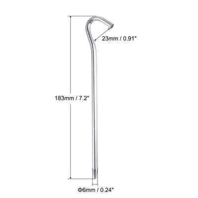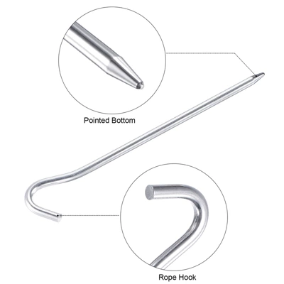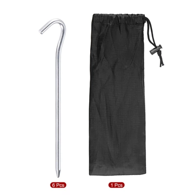 What is this?The tent stake adopts a round rod design with a hook, which is convenient for hanging windproof ropes. The pointed bottom makes the peg is easier to nail into the ground. Widely used in various venues, such as beach, sand, lawn, soil and so on to fix your camping tent, canopy, picnic mat, rain tarps, fabric net, outdoor inflatable sofa, etc.What will I get?Material: Aluminum AlloyStake Size: 183x6mm / 7.2″x0.24″ (L*Dia.)Hook Opening Width: 23mm / 0.91″Package Content: 6 x Tent Stakes, 1 x Storage BagAre there any advantages of the product?These aluminum ground pegs are waterproof, windproof, rustproof, lightweight, easy to carry, durable and not easy to be bend. Comes with a bag for storage.How to use it?1. It is recommended that tent stakes and the ground are at an angle of 60 degrees, with the tip facing the tent; leave the upper end about length 3cm in on the ground;2. Hit stakes with a hammer or hard object to fix them on the ground;3. Hang the tent windproof rope on the hook;4. If you want to take out stakes, you can use a hammer with a hook or hang a rope on the stake to pull it out.What should I notice?Please be careful with your hands when using the ground pegs kit.